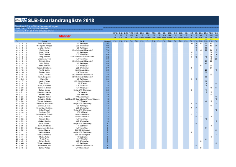 Beim Marathon in St. Wendel wurden Jens Ehrich (LSG Schmelz-Hüttersdorf) seine hart verdienten Punkte nun gutgeschrieben. Für den Deutsch-Französischen Straßenlauf (Halbmarathon) im März erfolgte im Seniorenbereich (ab 40 Jahre) eine umfangreichere Korrektur. Die Punkte wurden nach der Volkslaufliste vergeben. Eine Verdopplung der Punktzahl erfolgte nicht, weil es sich lediglich um die Meisterschaften in der Aktiven handelte. Bei den unter 40-jährigen blieb es bei der Punktvergabe nach der Meisterschaftsergebnisliste.
