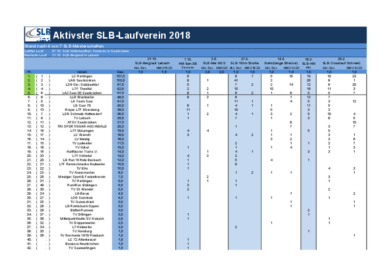 Insgesamt haben 85 SLB-Senioren aus 26 Vereinen beim Halbmarathon das Ziel erreicht. An der Spitze tummeln sich drei Vereine mit nur 9,5 Punkten Abstand. Es führt der LC Rehlingen mit 107 Punkten vor der LAG Saarbrücken (103,5 Punkte) und der LSG Saarbrücken-Sulzbachtal (97,5 Punkte). Danach klafft eine Lücke von 35 Punkten zu LTF Theeltal. Neu unter den ersten 5 findet sich nun LAZ Saar 05 Saarbrücken, nur 5,5 Punkte hinter Theeltal. Der Vorsprung auf Rang 6 beträgt aktuell 11 Punkte zur LLG Wustweiler. Das LA Team Saar ist von Platz 5 auf 7 zurückgefallen. Insgesamt ist vor dem Berglauf am 21.10. in Lebach sowohl für die ersten drei im Kampf um die Spitze, als auch für die Gruppe der Vereine, die um Rang 5 ringen, bei Abständen von um 10 Punkten noch alles drin. Der SLB wird sich über rege Teilnahme bei den abschließenden Berglaufmeisterschaften sehr freuen. Text/Aufstellung: Andreas Jahn